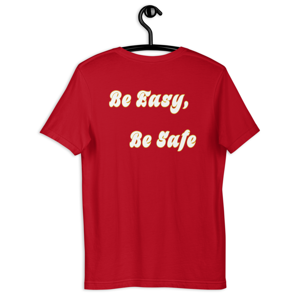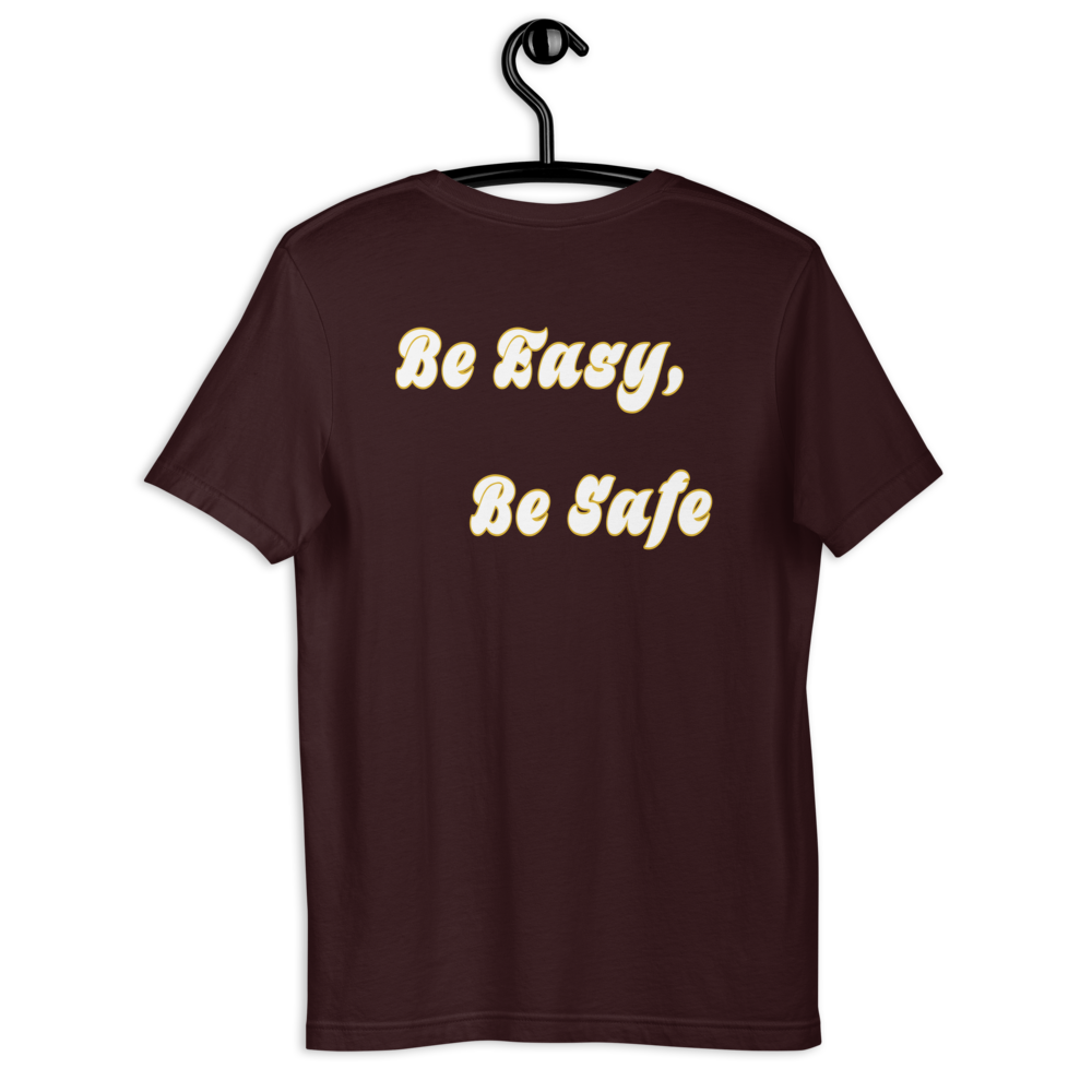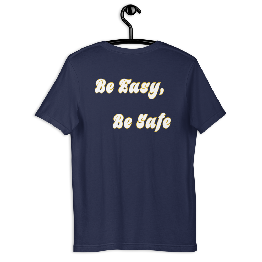Be Easy, Be Safe in white with yellow outline